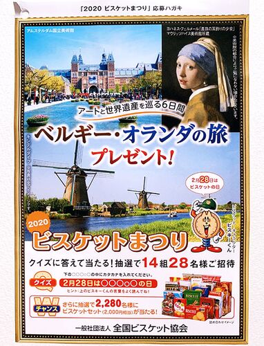 2020年ビスケットまつりキャンペーンアートと世界遺産を巡る6日間ベルギー・オランダの旅プレゼント! 賞品 アートと世界遺産を巡る6日間ベルギー・オランダの旅/14組28名 <Wチャンス>ビスケットセット2,000円相当/2,280名 応募方法 ネットで応募、ハ…
