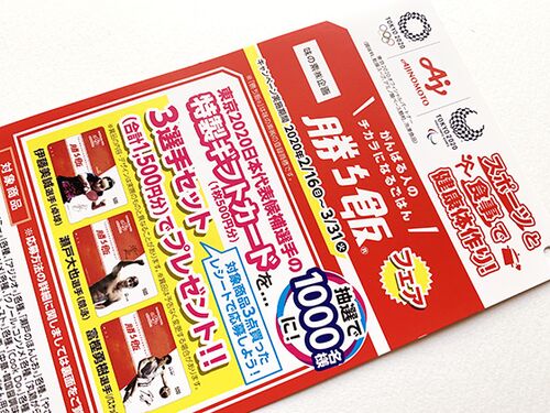 味の素企画スポーツと食事で健康体作り!「勝ち飯」フェア 賞品 東京2020日本代表候補選手の特製ギフトカード(1枚500円分)の3選手セット/1,000名・伊藤美誠選手(卓球)・瀬戸大也選手(競泳)・富樫勇樹選手(バスケットボール) 応募方法 キャンペー…