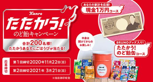 カンロ飴たたかう!のど飴キャンペーン 賞品 <現金1万円コース>総計100名現金1万円 <たたかう!のど飴缶コース>総計100名BRUNOグッズ、のど飴詰め合わせ入りたたかう!のど飴缶 応募方法 対象商品のバーコード5枚をハガキに貼って応募 応募期間 第1…