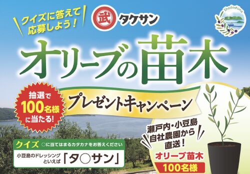 タケサンオリーブの苗木プレゼントキャンペーン 賞品 瀬戸内・小豆島自社農園から直送!オリーブ苗木/100名 応募方法 キャンペーン期間中、ハガキに必要事項(郵便番号、住所、名前、年齢、性別、電話番号、クイズの答え)を記入の上、応募 宛先/〒761-441…