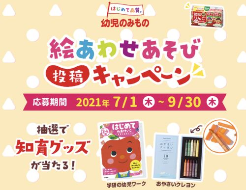 グリコ幼児のみもの絵あわせあそび投稿キャンペーン 賞品 「学研の幼児ワーク」2〜4歳はじめてのおけいこ+おやさいクレヨン/50名 応募方法 1)絵あわせパッケージが写っている写真や動画を撮影2)幼児のみもの 公式アカウント(@youji_nomimonopr) …