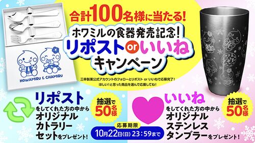 三幸製菓ホワミルの食器発売記念!三幸製菓公式X(Twitter)フォロー&リポスト(RT)or いいねキャンペーン 賞品 【フォロー&リポストで応募】オリジナルカトラリーセット/50名 【フォロー&いいねで応募】オリジナルステンレスタンブラー/50名 応募方法 …