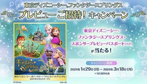 KIRIN東京ディズニーシー®ファンタジースプリングスプレビューご招待!キャンペーン 賞品 <A> プレビューご招待コースグランドオープン前の「ファンタジースプリングス」を一足先に楽しもう!東京ディズニーシー®ファンタジースプリングス・スポンサープレ…