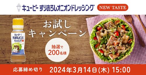 キユーピーすりおろしオニオンドレッシングお試しキャンペーン 賞品 キユーピードレッシング2本セット/200名 ・キユーピー すりおろしオニオンドレッシング 180ml・キユーピー ごま油&ガーリックドレッシング 180ml各1本 応募方法 キャンペーンサイトの…