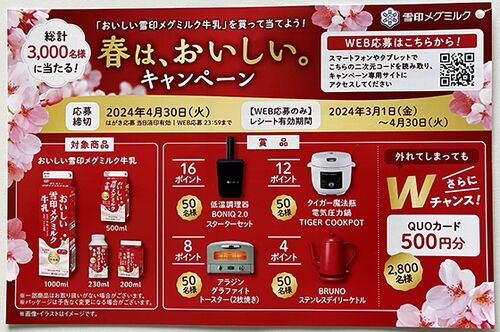 雪印メグミルク「おいしい雪印メグミルク牛乳」を買って当てよう!春は、おいしいキャンペーン 賞品 <16ポイントコース>低温調理器 BONIQ 2.0 スターターセット/50名 <12ポイントコース>タイガー魔法瓶 電気圧力鍋/50名TIGER COOKPOT <8ポイントコー…
