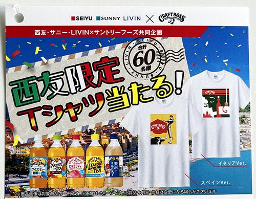西友・サニー・LIVIN×サントリーフーズ 共同企画西友限定Tシャツ当たる!キャンペーン 賞品 西友限定Tシャツ イタリアVer./30名 西友限定Tシャツ スペインVer./30名 応募方法 キャンペーン期間中に対象店舗でお買い上げの対象商品1本以上を含む合計1,0…