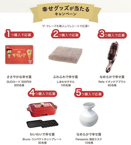 森永製菓 ザ・クレープ幸せグッズが当たるキャンペーン 賞品 <1つ購入で応募> ささやなか幸せ賞QUOカード500円分/300名 <2つ購入で応募> ふわふわで幸せ賞しあわせタオル/100名 <3つ購入で応募> なめらかで幸せ賞Refa イオンケアブラシ/60名 <…