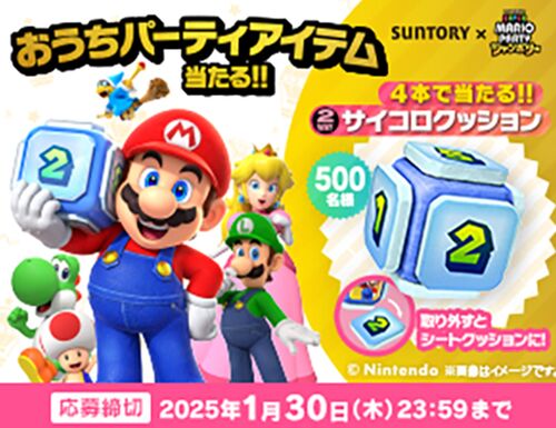 サントリー×スーパーマリオパーティジャンボリーおうちパーティアイテム当たる!キャンペーン 賞品 <対象商品4本購入で当たる!>スーパーマリオパーティジャンボリー2WAYサイコロクッション/500名 応募方法 LINEから購入レシートを送信して応募 応募期間…