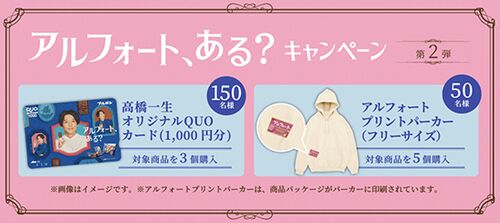 ブルボンアルフォート、ある?キャンペーン第2弾 賞品 高橋一生オリジナルQUOカード(1,000円分)/150名対象商品を3個購入で応募 アルフォートプリントパーカー(フリーサイズ)/50名対象商品を5個購入で応募 応募方法 応募期間中に対象商品を購入した…
