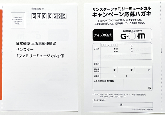 ハガキで、クイズの答え、住所、氏名、お子様の年齢、電話番号、よくご利用になる店舗名を記入の上、応募