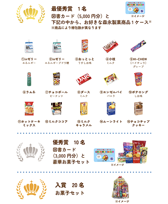 図書カード(5,000円分)と商品リストの中からお好きな森永製菓商品1ケース/1名