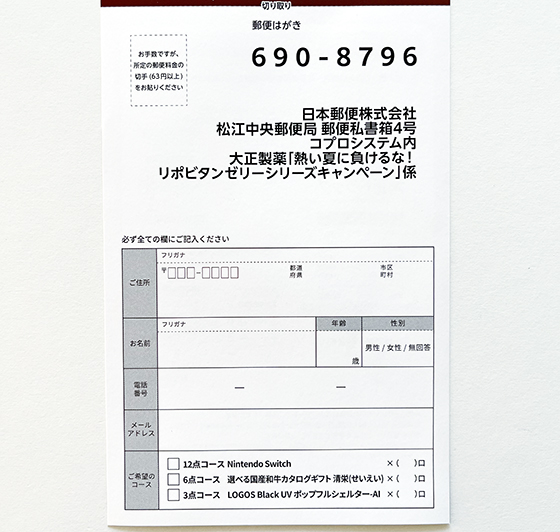 専用応募ハガキ又は郵便ハガキに必要事項と購入日、購入店名、希望のコースと口数を明記の上、ハガキ裏面に対象商品を購入された際のレシートをしっかりと貼り、所定の郵便料金の切手を貼って応募